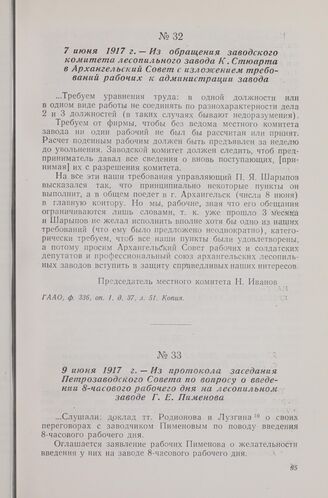 9 июня 1917 г. — Из протокола заседания Петрозаводского Совета по вопросу о введении 8-часового рабочего дня на лесопильном заводе Г. Е. Пименова