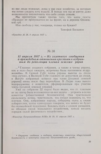 11 апреля 1917 г. — Из газетного сообщения о враждебном отношении крестьян к избранным до революции членам земских управ