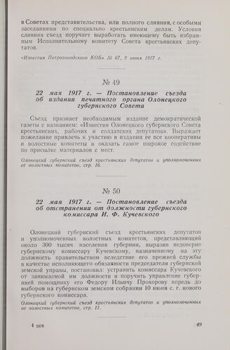 22 мая 1917 г. — I съезд крестьянских депутатов Олонецкой губернии. Постановление съезда об отстранении от должности губернского комиссара И. Ф. Кучевского