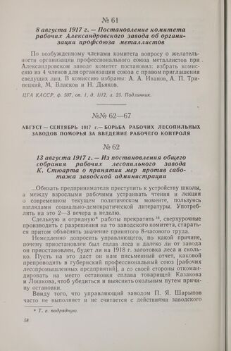 8 августа 1917 г. — Постановление комитета рабочих Александровского завода об организации профсоюза металлистов