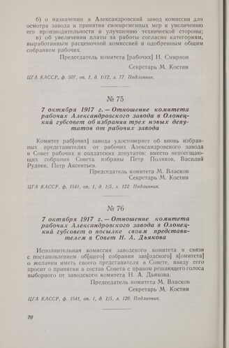 7 октября 1917 г. — Отношение комитета рабочих Александровского завода в Олонецкий губсовет об избрании трех новых депутатов от рабочих завода // ЦГА КАССР, ф. 1541, оп. 1, д. 1/5, л. 122. Подлинник.