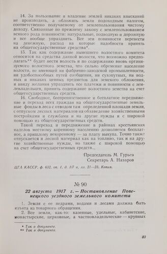 22 августа 1917 г. — Постановление Повенецкого уездного земельного комитета // ЦГА КАССР. ф. 632, оп. 1, д. 1/9. л. 19. Копия.