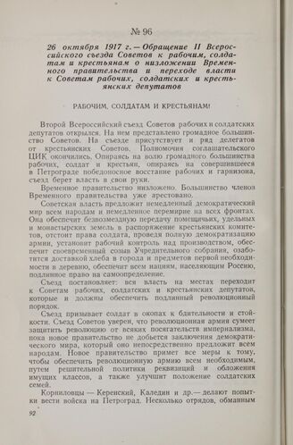26 октября 1917 г. — Обращение II Всероссийского съезда Советов к рабочим, солдатам и крестьянам о низложении Временного правительства и переходе власти к Советам рабочих, солдатских и крестьянских депутатов // В. И. Ленин. Сочинения, т. 26, стр. 215—216.