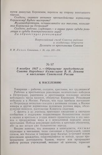 5 ноября 1917 г. — Обращение председателя Совета Народных Комиссаров В. И. Ленина к населению Советской России // В. И. Ленин. Сочинения, т. 26, стр. 265—267.