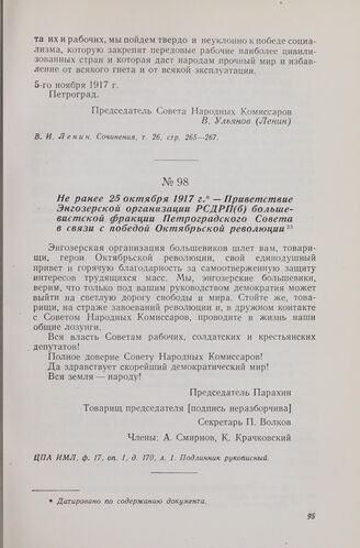 Не ранее 25 октября 1917 г. — Приветствие Энгозерской организации РСДРП(б) большевистской фракции Петроградского Совета в связи с победой Октябрьской революции // ЦПА ИМЛ, ф. 17, оп. 1, д. 170, л. 1. Подлинник рукописный.