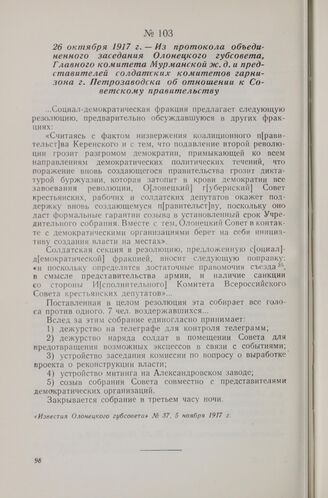 26 октября 1917 г. — Из протокола объединенного заседания Олонецкого губсовета, Главного комитета Мурманской ж. д. и представителей солдатских комитетов гарнизона г. Петрозаводска об отношении к Советскому правительству