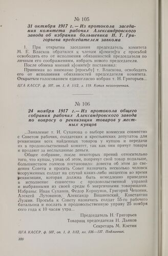 31 октября 1917 г. — Из протокола заседания комитета рабочих Александровского завода об избрании большевика Н. Т. Григорьева председателем завкома
