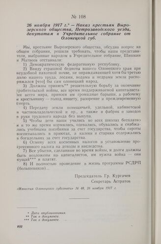 26 ноября 1917 г. — Наказ крестьян Вырозерского общества, Петрозаводского уезда, депутатам в Учредительное собрание от Олонецкой губ.