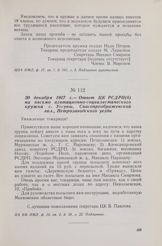 20 декабря 1917 г. — Ответ ЦК РСДРП(б) на письмо агитационно-социалистического кружка с. Уссуны, Спасопреображенской вол., Петрозаводского уезда // ПА КФ ИМЛ, ф. 14, оп. 2, д. 58, л. 22. Подлинник.