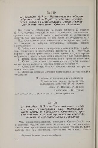 27 декабря 1917 г. — Постановление общего собрания солдат Корбозерской вол., Пудожского уезда, об установлении связи с центральными органами Советской власти // ЦГА КАССР, ф. 745, оп. 1, д. 1/2, л. 2. Копия рукописная.