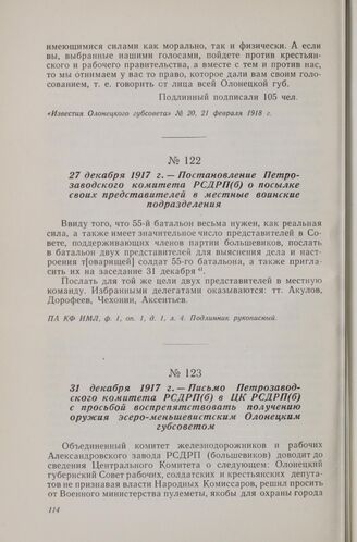 27 декабря 1917 г. — Постановление Петрозаводского комитета РСДРП(б) о посылке своих представителей в местные воинские подразделения // ПА КФ ИМЛ, ф. 1, оп. 1, д. 1, л. 4. Подлинник рукописный.