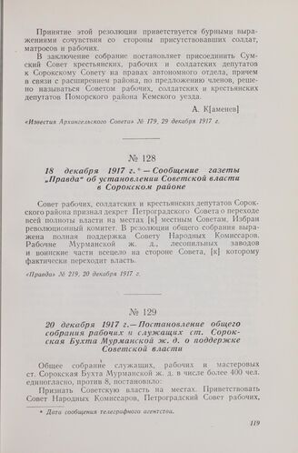 20 декабря 1917 г. — Постановление общего собрания рабочих и служащих ст. Сорокская Бухта Мурманской ж. д. о поддержке Советской власти