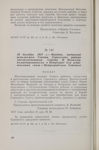 24 декабря 1917 г. — Мандат, выданный исполкомом Совета Сорокского района уполномоченному Совета И. Яковлеву, командированному в Петроград для установления связи с Петроградским Советом // ЦГАОР СССР, ф. 393, оп. 2, д. 24, л. 134. Подлинник.