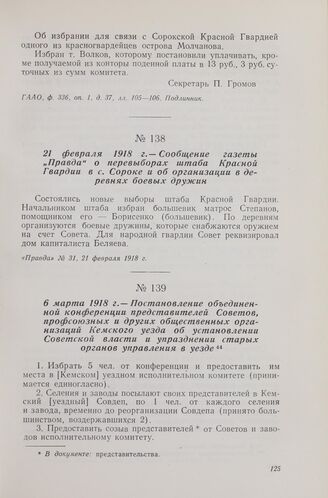 6 марта 1918 г. — Постановление объединенной конференции представителей Советов, профсоюзных и других общественных организаций Кемского уезда об установлении Советской власти и упразднении старых органов управления в уезде // ГААО, ф. 352, оп. 1, д. 17, лл. 84—85. Подлинник рукописный.