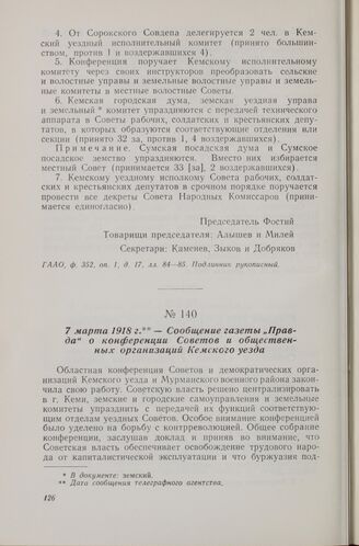 7 марта 1918 г. — Сообщение газеты «Правда» о конференции Советов и общественных организаций Кемского уезда // «Правда» № 45, 9 марта 1918 г.