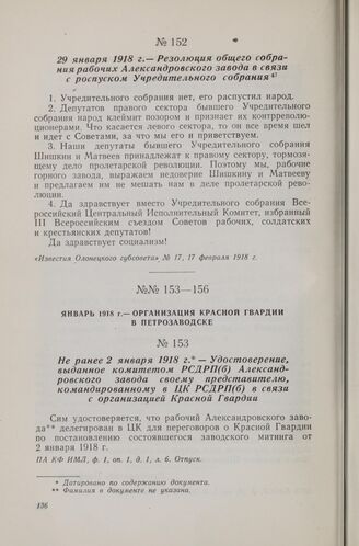 29 января 1918 г. — Резолюция общего собрания рабочих Александровского завода в связи с роспуском Учредительного собрания // «Известия Олонецкого губсовета» № 17, 17 февраля 1918 г.