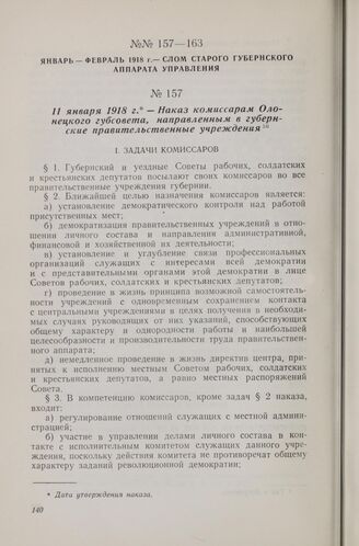 11 января 1918 г. — Наказ комиссарам Олонецкого губсовета, направленным в губернские правительственные учреждения // ЦГА КАССР, ф. 28, оп. 1, д. 2/9, лл. 25—26. Подлинник. Опубликовано в газете «Известия Олонецкого губсовета» № 10, 23 января 1918 г.