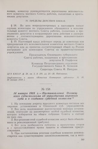 14 января 1918 г. — Постановление Олонецкого губисполкома об упразднении мирового суда и о создании судебной комиссии // «Известия Олонецкого губсовета» № 6, 16 января 1918 г.