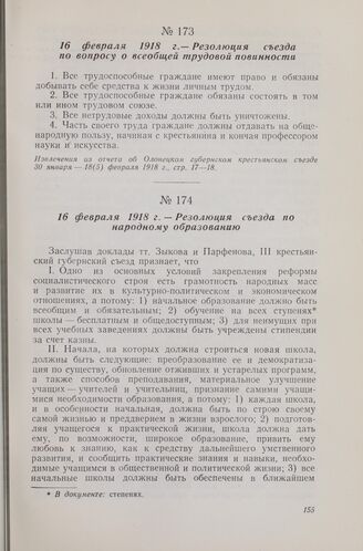 16 февраля 1918 г. — III съезд крестьянских депутатов Олонецкой губернии. Резолюция съезда по вопросу о всеобщей трудовой повинности // Извлечения из отчета об Олонецком губернском крестьянском съезде 30 января—18(5) февраля 1918 г., стр. 17—18.