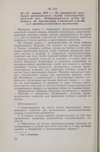 24—25 марта 1918 г. — Из протокола заседания крестьянского съезда Спасопреображенской вол., Петрозаводского уезда, по вопросу об организации Советской власти и о продовольственном положении // ЦГА КАССР, ф. 323, оп. 1, д. 2/16, лл. 2, 4—6. Копия рукописная.