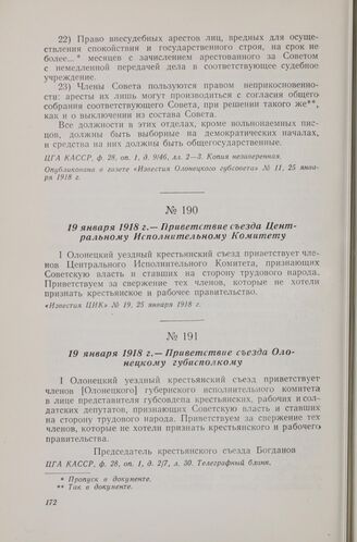 19 января 1918 г. — I съезд крестьянских депутатов Олонецкого уезда. Приветствие съезда Олонецкому губисполкому // ЦГА КАССР, ф. 28, оп. 1, д. 2/7, л. 30. Телеграфный бланк.