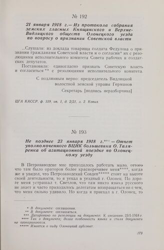 Не позднее 23 января 1918 г. — Отчет уполномоченного ВЦИК большевика О. Таляренка об агитационной поездке по Олонецкому уезду