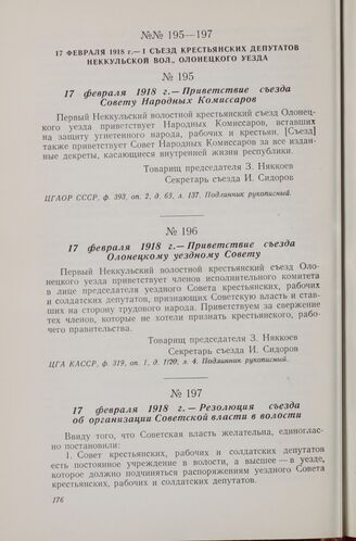 17 февраля 1918 г. — I съезд крестьянских депутатов Неккульской волости Олонецкого уезда. Резолюция съезда об организации Советской власти в волости // ЦГА КАССР, ф. 319, оп. 1, д. 1/20, лл. 2—3. Копия рукописная.