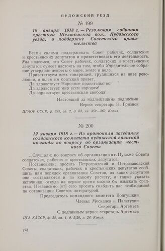 10 января 1918 г. — Резолюция собрания крестьян Шелтомской вол., Пудожского уезда, о поддержке Советского правительства // ЦГАОР СССР, ф. 393, оп. 2, д. 63, лл. 359—360. Копия.