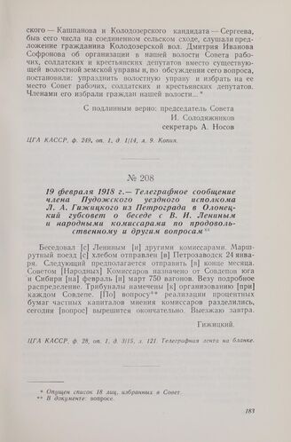 19 февраля 1918 г. — Телеграфное сообщение члена Пудожского уездного исполкома Л. А. Гижицкого из Петрограда в Олонецкий губсовет о беседе с В. И. Лениным и народными комиссарами по продовольственному и другим вопросам