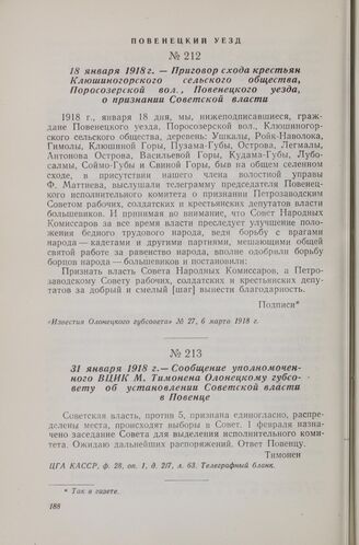 18 января 1918 г. — Приговор схода крестьян Клюшиногорского сельского общества, Поросозерской вол., Повенецкого уезда, о признании Советской власти