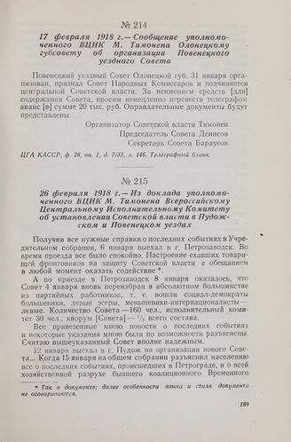 26 февраля 1918 г. — Из доклада уполномоченного ВЦИК М. Тимонена Всероссийскому Центральному Исполнительному Комитету об установлении Советской власти в Пудожском и Повенецком уездах // ЦГАОР СССР, ф. 393, оп. 2, д. 63, лл. 30—31. Подлинник.