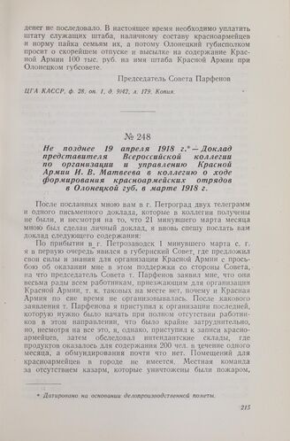 Не позднее 19 апреля 1918 г. — Доклад представителя Всероссийской коллегии по организации и управлению Красной Армии И. В. Матвеева в коллегию о ходе формирования красноармейских отрядов в Олонецкой губ. в марте 1918 г.