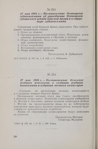 27 мая 1918 г. — Постановление Кемского уездного исполкома о создании уездного военкомата и избрании военных комиссаров // ГААО, ф. 352, оп. 1, д. 17, л. 209. Копия.