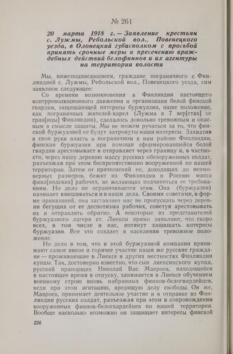 20 марта 1918 г. — Заявление крестьян с. Лужмы, Ребольской вол., Повенецкого уезда, в Олонецкий губисполком с просьбой принять срочные меры к пресечению враждебных действий белофиннов и их агентуры на территории волости