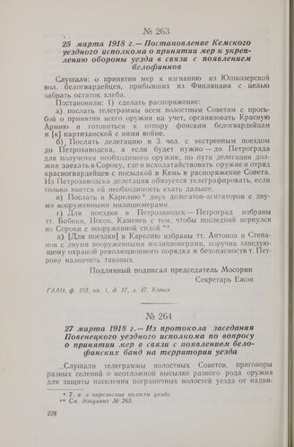 25 марта 1918 г. — Постановление Кемского уездного исполкома о принятии мер к укреплению обороны уезда в связи с появлением белофиннов // ГААО. ф. 352, оп. 1, д. 17, л. 47. Копия.