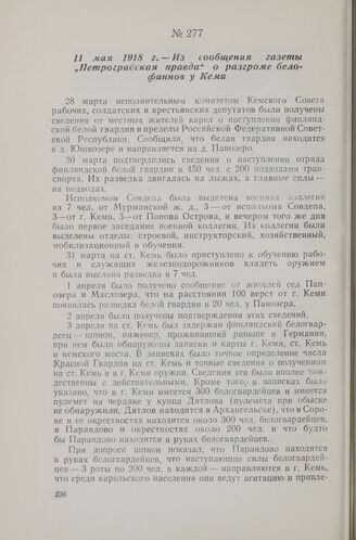11 мая 1918 г. — Из сообщения газеты «Петроградская правда» о разгроме белофиннов у Кеми // «Петроградская правда» № 94, 11 мая 1918 г. Опубликовано в сборнике документов «Разгром белофинских интервентов в Карелии в 1918—1922 гг.». Госиздат КФССР, 1944, стр. 47—52.