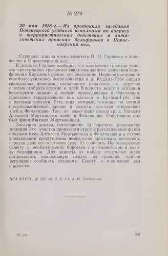 20 мая 1918 г. — Из протокола заседания Повенецкого уездного исполкома по вопросу о террористических действиях и антисоветских происках белофиннов в Поросозерской вол. // ЦГА КАССР, ф. 352, оп. 3, д. 1/1, л. 46. Подлинник.