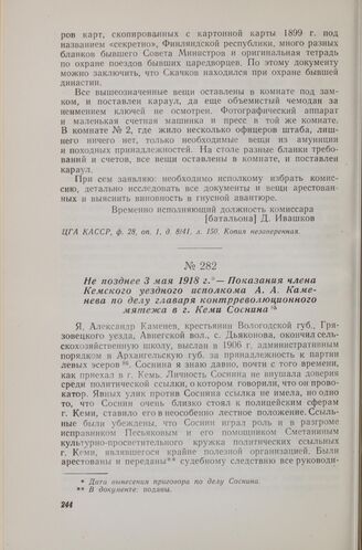 Не позднее 3 мая 1918 г. — Показания члена Кемского уездного исполкома А. А. Каменева по делу главаря контрреволюционного мятежа в г. Кеми Соснина // ЦГА КАССР, ф. 902, оп. 1, д. 23, л. 3. Копия.