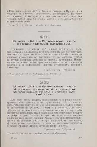 25 июня 1918 г. — Съезд уездных военных комиссаров и военных руководителей Олонецкой губернии. Постановление съезда о военном положении Олонецкой губ. // ЦГА КАССР, ф. 573, оп. 1, д. 2/13, л. 52. Подлинник.