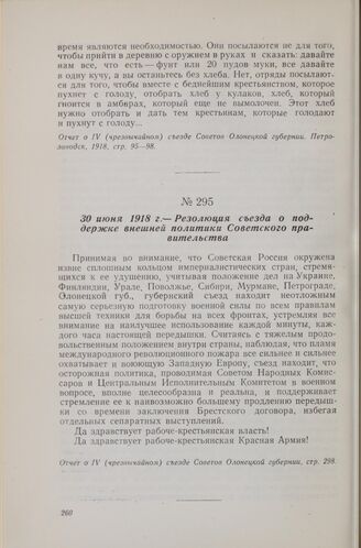 30 июня 1918 г. — IV Чрезвычайный съезд Советов Олонецкой губернии. Резолюция съезда о поддержке внешней политики Советского правительства // Отчет о IV (чрезвычайном) съезде Советов Олонецкой губернии, стр. 298.
