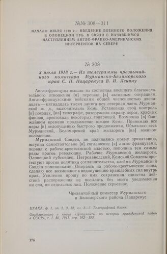 3 июля 1918 г. — Из телеграммы чрезвычайного комиссара Мурманско-Беломорского края С. П. Нацаренуса В. И. Ленину // ЦГАКА, ф. 1, оп. 2, д. 22, лл. 3—5. Телеграфный бланк. Опубликовано в книге «Документы по истории гражданской войны в СССР», т. I. М., 1941, стр. 192—193.