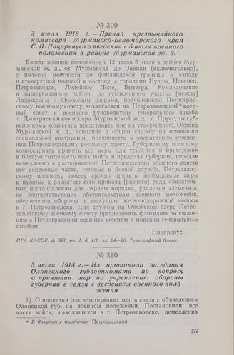5 июля 1918 г. — Из протокола заседания Олонецкого губвоенкомата по вопросу о принятии мер по укреплению обороны губернии в связи с введением военного положения