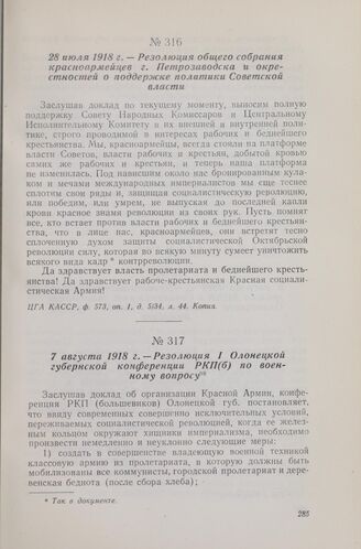 7 августа 1918 г. — Резолюция I Олонецкой губернской конференции РКП(б) по военному вопросу // ЦПА ИМЛ, ф. 17, оп. 4/с, д. 4, л. 94. Копия.