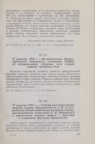 17 августа 1918 г. — Телеграмма начальника отряда охраны Мурманской ж. д. И. Д. Спиридонова Петрозаводскому военному совету, чрезвычайному комиссару С. П. Нацаренусу и управлению охраны дороги с просьбой о скорейшей присылке бронепоезда // ЦГА КАССР, ф. 573, оп. 1, д. 9/85, лл. 12—13. Телеграфный бланк.