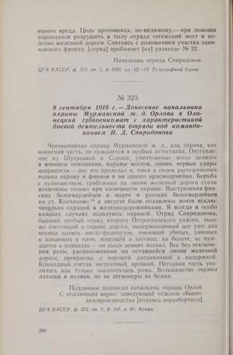 8 сентября 1918 г. — Донесение начальника охраны Мурманской ж. д. Орлова в Олонецкий губвоенкомат с характеристикой боевой деятельности отряда под командованием И. Д. Спиридонова // ЦГА КАССР, ф. 573, оп. 1, д. 1/3, л. 41. Копия.