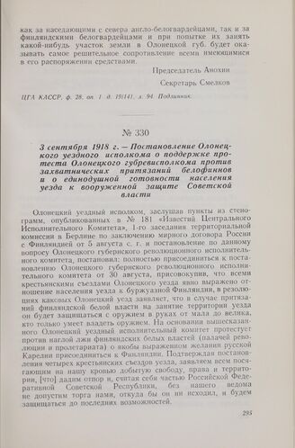 3 сентября 1918 г. — Постановление Олонецкого уездного исполкома о поддержке протеста Олонецкого губревисполкома против захватнических притязаний белофиннов и о единодушной готовности населения уезда к вооруженной защите Советской власти