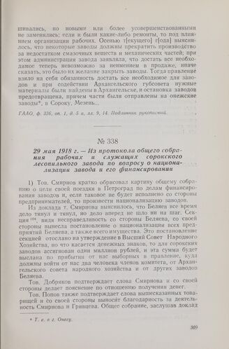 29 мая 1918 г. — Из протокола общего собрания рабочих и служащих сорокского лесопильного завода по вопросу о национализации завода и его финансировании