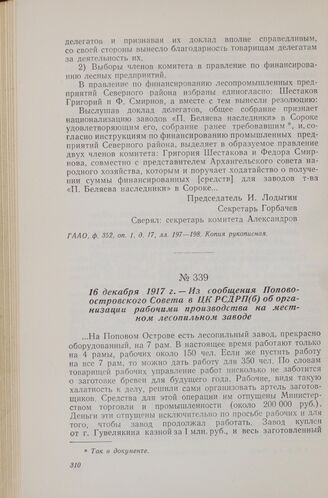 16 декабря 1917 г. — Из сообщения Поповоостровского Совета в ЦК РСДРП(б) об организации рабочими производства на местном лесопильном заводе // ЦПА ИМЛ, ф. 17, оп. 1, д. 64 а, л. 205. Опубликовано в газете «Правда» № 7, 11 января 1918 г.