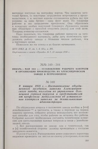 9 января 1918 г. — Постановление объединенного заседания завкома Александровского завода, коллегии по управлению Олонецким горным округом и представителей от профсоюза металлистов об установлении контроля завкома за деятельностью администрации // ЦГА КАССР, ф. 507, оп. 1, д. 2/11, л. 4. Копия.