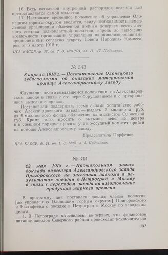 23 мая 1918 г. — Протокольная запись доклада инженера Александровского завода Пригоровского на заседании завкома о результатах поездки в Петроград и Москву в связи с переходом завода на изготовление продукции мирного времени // ЦГА КАССР, ф. 37, оп. 2, д. 189/1804, лл. 21—22. Подлинник.